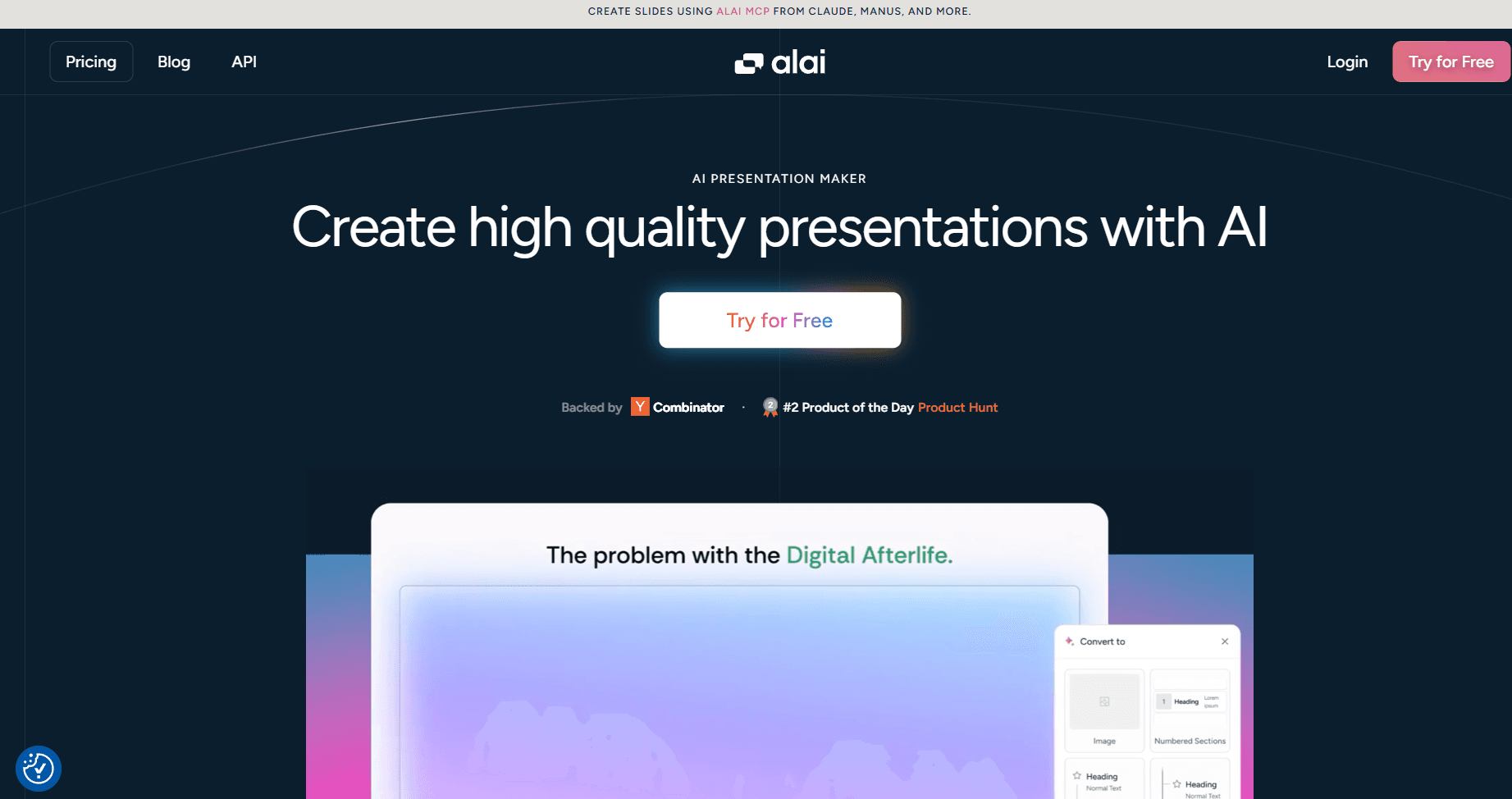 Alai is an AI presentation maker built from the ground up with AI at its core. Unlike Kimi, which focuses on research and content generation, Alai was designed specifically for creating high-quality slides with AI assistance throughout the entire process, from first draft to final polish.