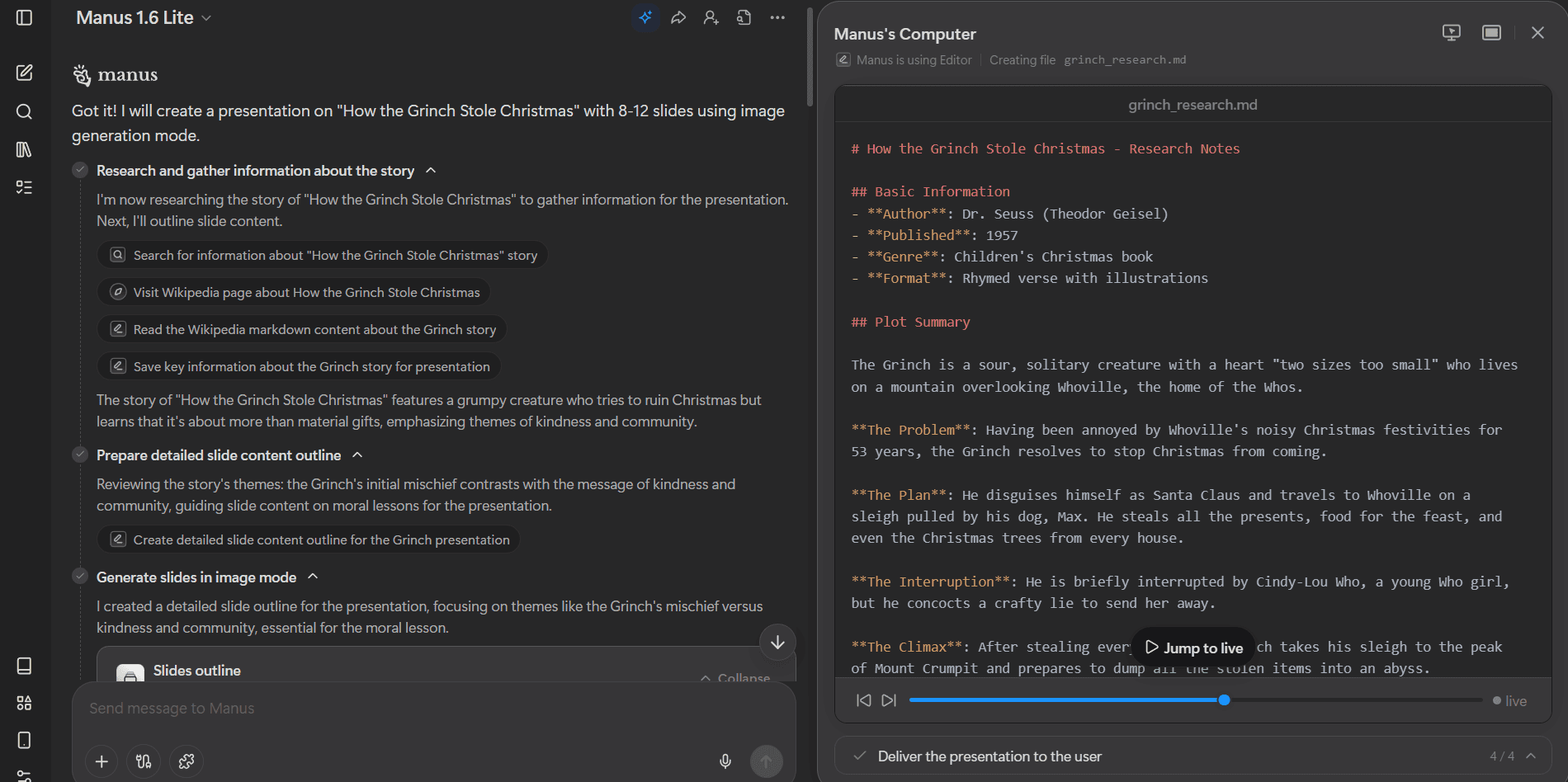 Manus is the tool to reach for when content accuracy matters more than visual polish. Built on an agentic AI system, its superpower is deep, autonomous research. It doesn't just format your ideas into slides, it actively investigates your topic across multiple sources before building the deck.