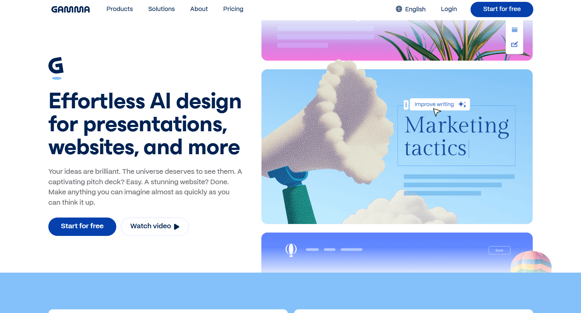 Gamma | Remote teams and multi-format content creation | Free (limited) + $10–20/mo | Scrollable card-based layout, real-time collaboration, embedded polls/videos/charts, website and social media generation, GPT-Image-1, one-click redesign |