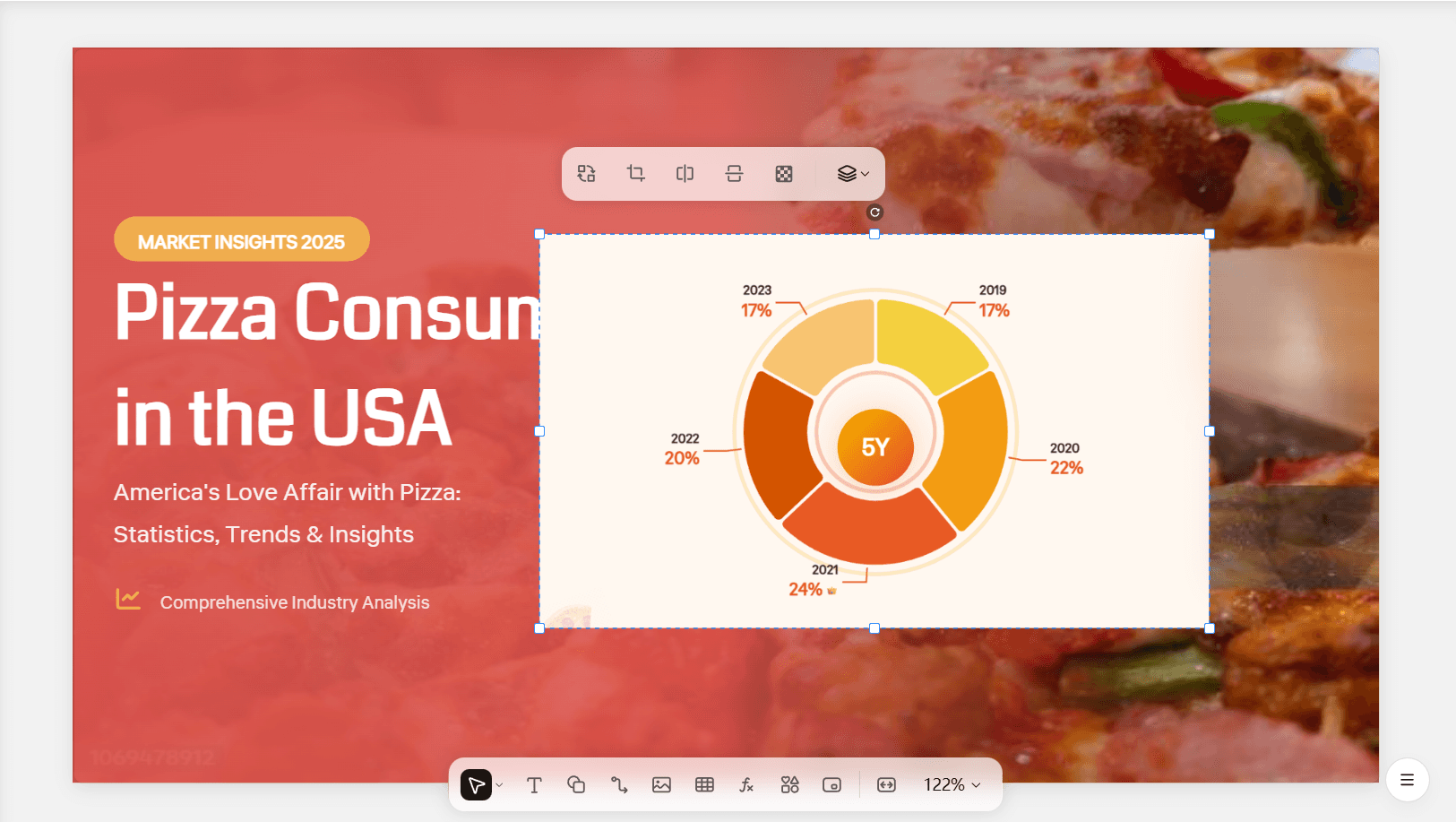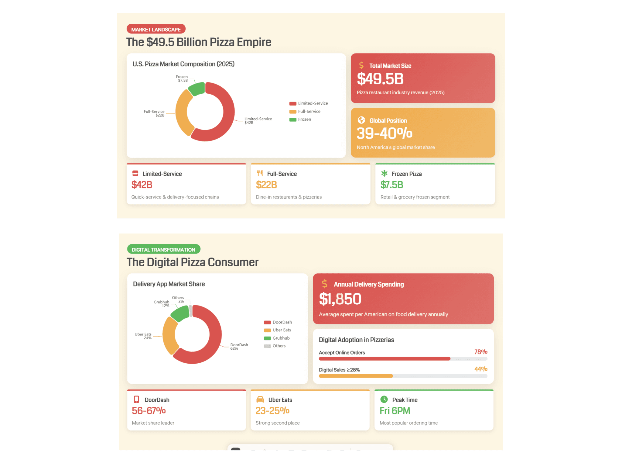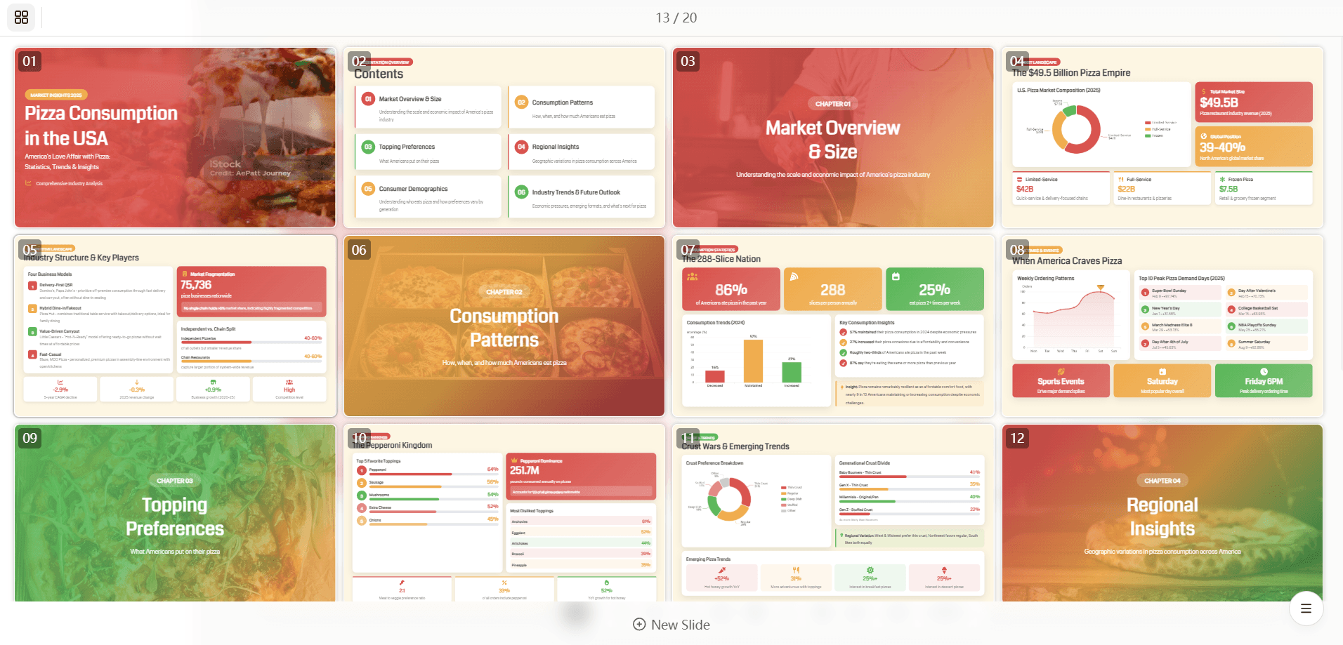 No supporting images beyond title slides: As seen in the overview attached below, across the entire deck, Kimi only used images as background visuals on the title and section divider slides. The content slides themselves - where images would actually add value - had zero photography, illustrations, or visual assets. Every data point, trend, and insight was communicated purely through charts, icons, and text. For a topic like pizza consumption, relevant imagery (store formats, regional food culture, delivery trends) would have made the narrative far more engaging. This is a noticeable gap, especially compared to tools like Alai and Gamma that weave supporting visuals throughout the deck.