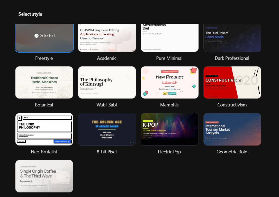 Kimi offers a decent range of templates for both Adaptive and Visual generation, but the library is limited and you can't create or reuse custom themes. In my testing, Kimi repeated the same 2-3 layouts across a 20-slide deck.