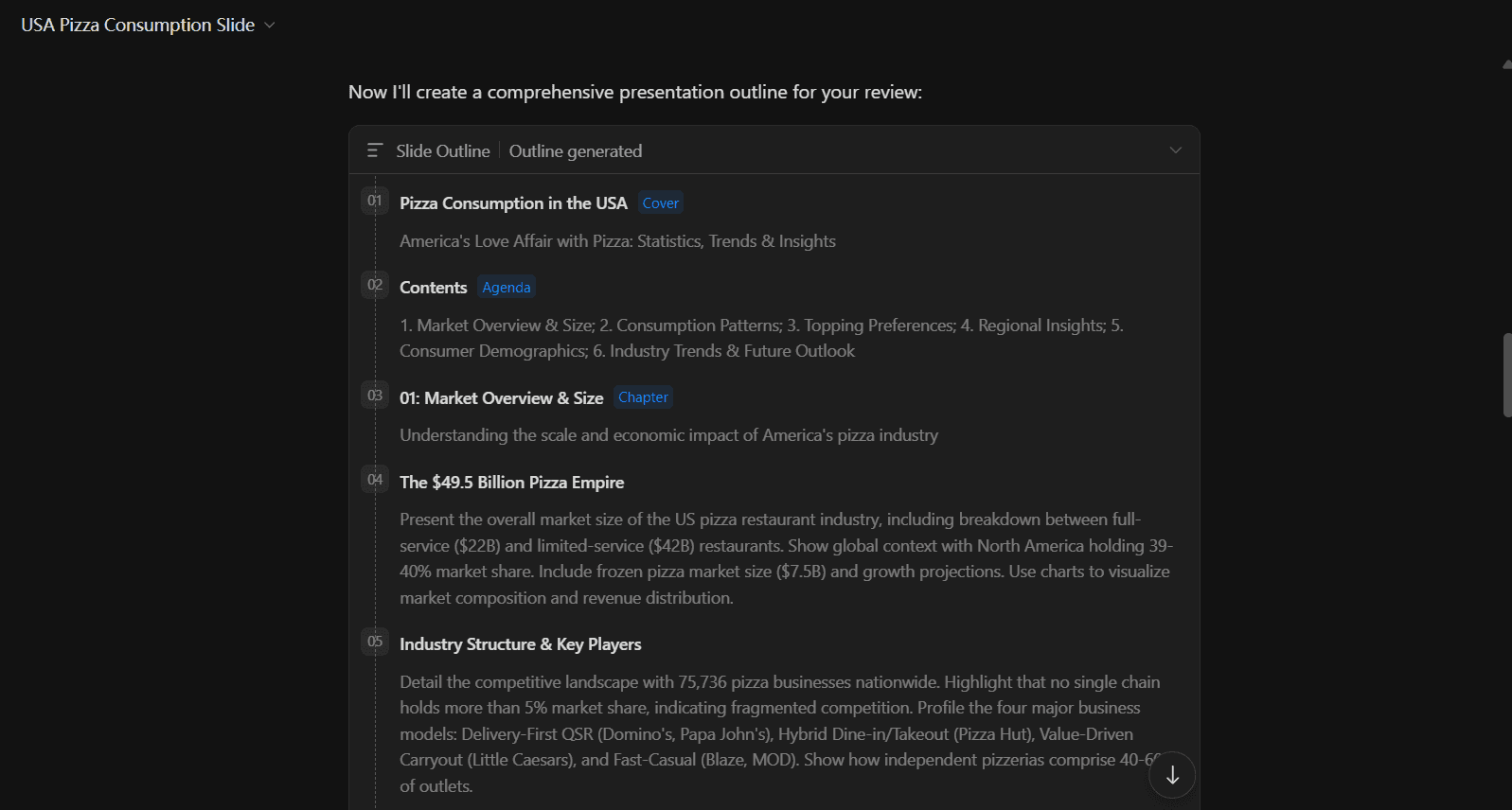 In my initial test - I provided Kimi’s slide agent with a simple prompt - “Help me make a deck on Pizza Consumption in the USA”. Here’s what I got as the results: