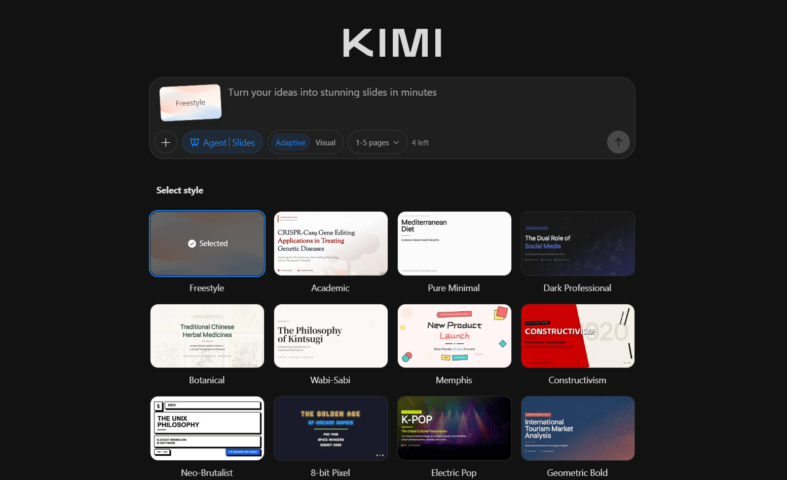 Step 5 - Choose a Template + Slide Volume: Select the number of slides you want in your deck and pick a design from the available templates. Once chosen, Kimi's AI agent builds your slides in real time, right before your eyes, placing content into the layout, adding visual elements, and formatting everything.
