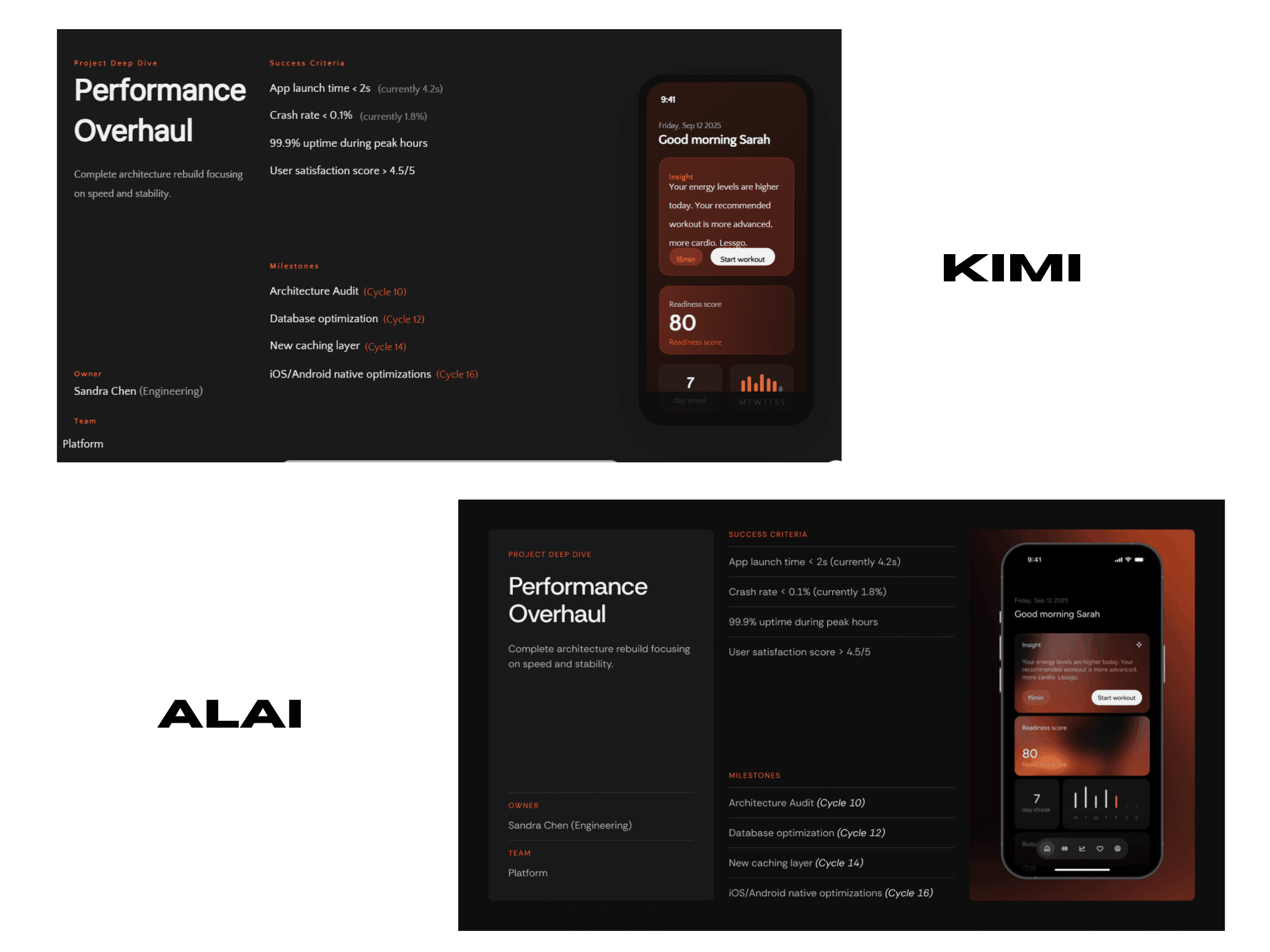 When you compare the same content across both platforms, Kimi produces slides that rely on 2-3 repeating layouts across a 20-slide deck. Alai produces slides with visual character: layered sections, sophisticated color relationships, and design choices that feel intentional rather than templated.