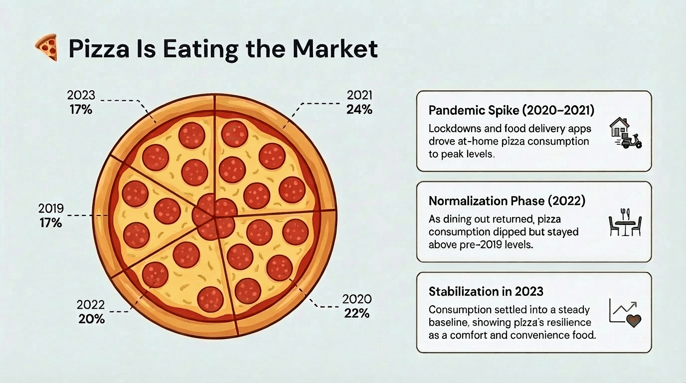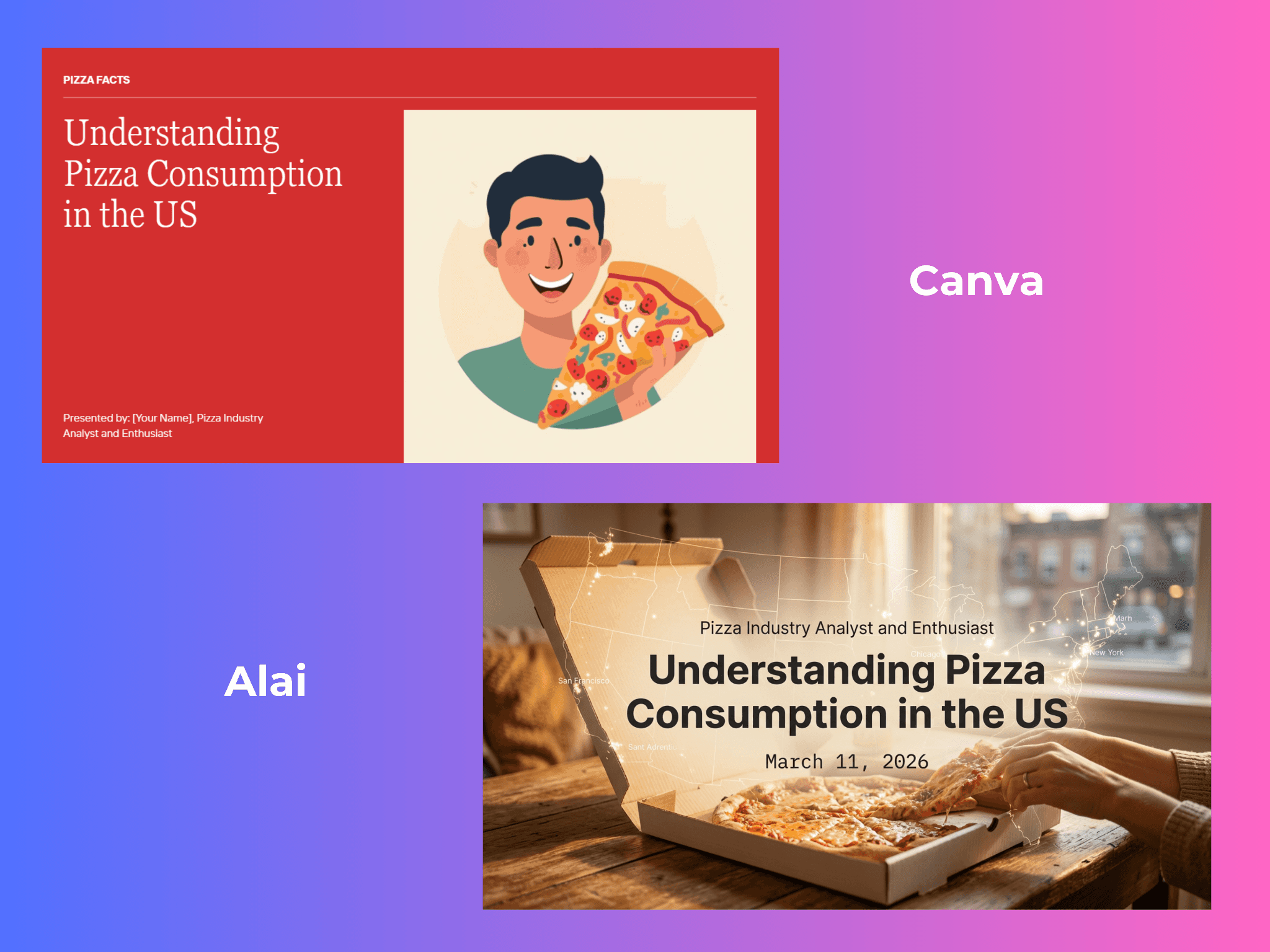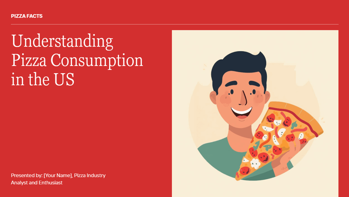 Alai also integrates Nano Banana 2 - arguably the best AI image generation model for presentations right now. You can use it during generation (it's one of the four layout options) or apply it to existing slides for visual polish. As a non-designer, this is one of my favourite features on Alai. The quality of the slides is something I'd never be able to create on my own, and the design pre-sets make it even easier since you don't need to figure out the right prompt to get good results. Look at what I created just by prompting the AI with 'Create a slide on USA Pizza Consumption, add a pie chart made of Pizza'.