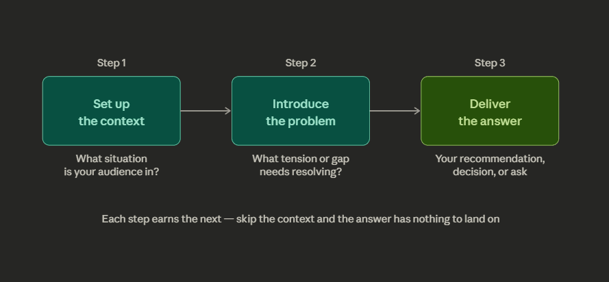 The most durable structure is: situation, complication, resolution. Set up the context, introduce the problem, deliver the answer. It works because it follows the same shape as every story humans have ever told: news articles, films, case studies. The audience is already wired to follow it.