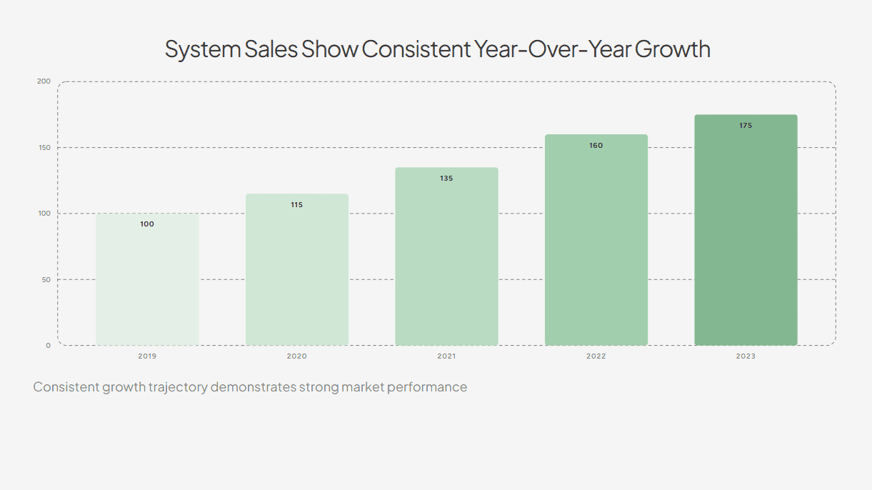 For example, this slide focuses on a clear title summarising the data while the bars are colored in a way to direct attention to the current (and also best performing) year.