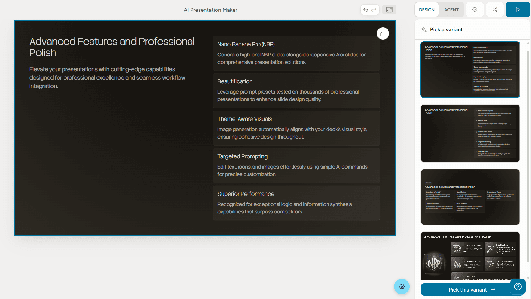 Look for: the ability to generate multiple design options per slide (not just one), control over spatial composition and layout (not just template selection), iterative refinement capability (slide-by-slide, not just whole-deck generation), context-aware AI that understands your entire deck (not just individual slides), and a design system that maintains visual coherence across slides while still allowing variety. Avoid tools where the only customization options are color palette and font.