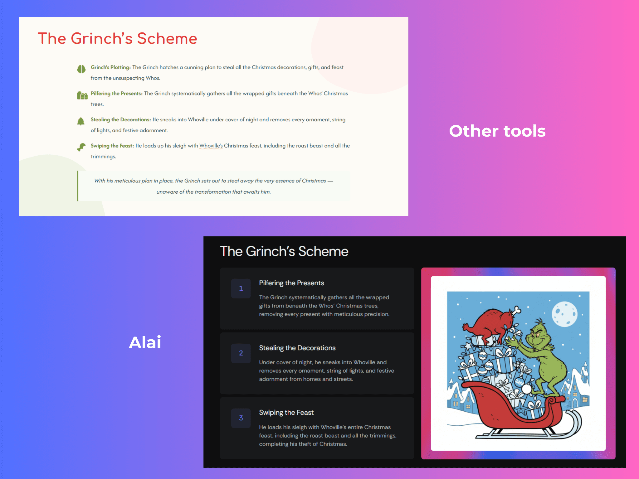 Here's an example of the same content built in a typical AI tool versus Alai: