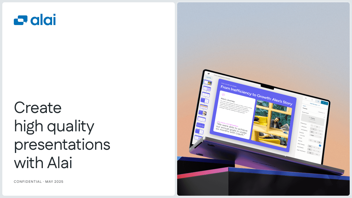 Built for iteration, not just generation. Getting to a great slide is rarely a one-step process, and Alai is built with that in mind. The AI gets you to a strong starting point, but it also gives you full control to refine from there. Tweak any element manually or with AI, reshape a layout, adjust spacing, or break the pattern entirely for emphasis. The goal is to handle the heavy lifting so you can focus on the last 20% that makes a deck feel truly yours.