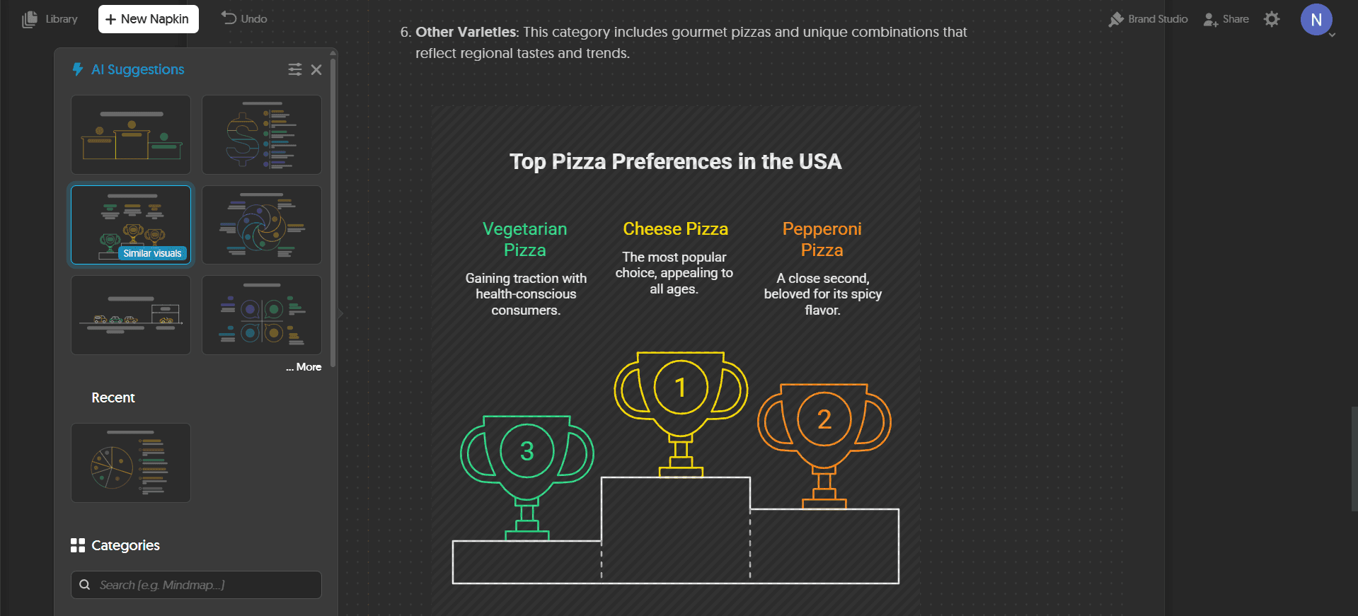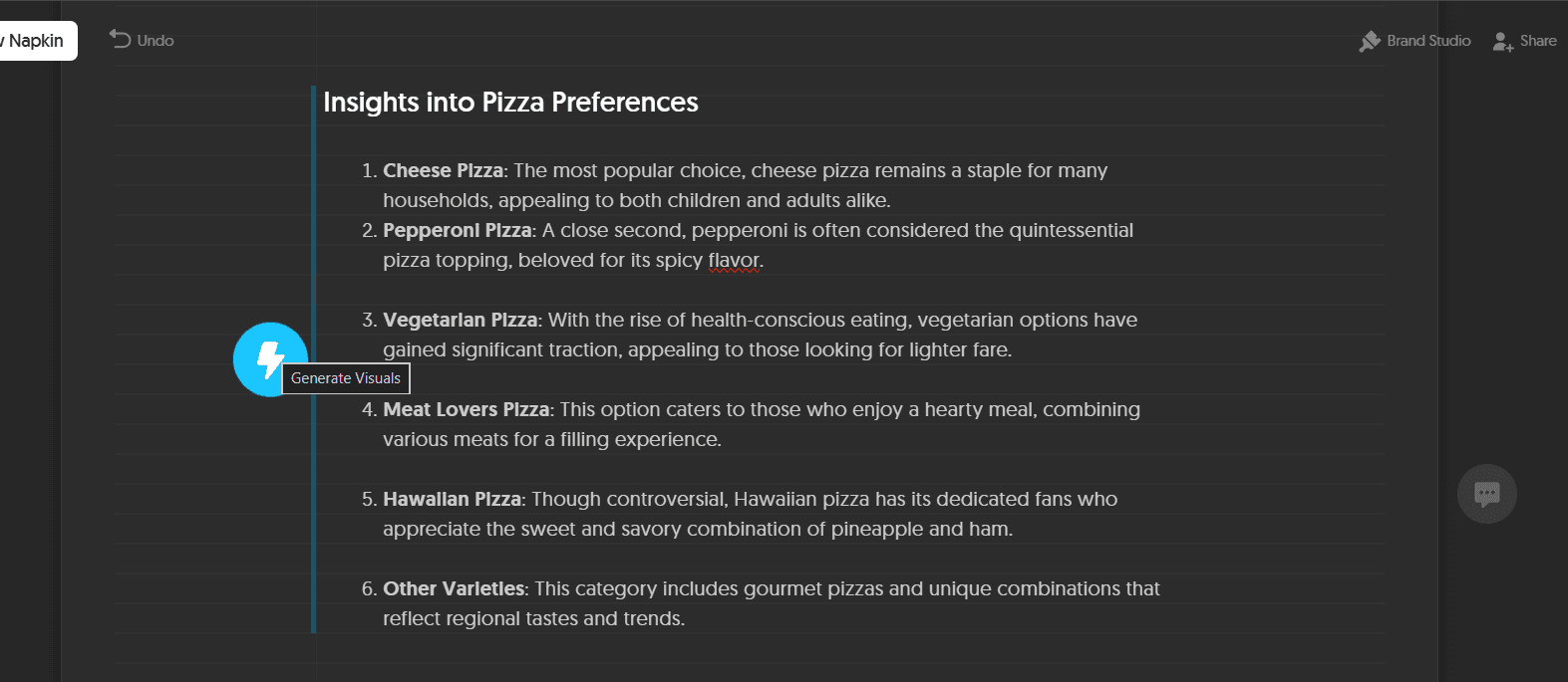Visuals only generate for content you select. This is worth understanding before you try it. Napkin AI does not scan your entire document and auto-generate visuals everywhere. You highlight a specific paragraph or bullet block, click the spark icon, and the AI generates options for that section only. This matters for presentation workflows because it means you stay in control of which parts of your content become visuals and which stay as text. You're not fighting AI decisions about what to visualize; you're directing them.