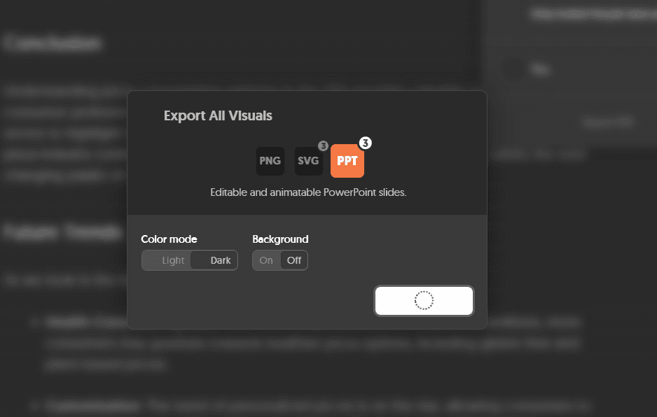 Export. PNG at 1x/2x/3x resolution, SVG, PDF, or editable PPTX. Light and dark mode toggles are available at export. Transparent background is optional.