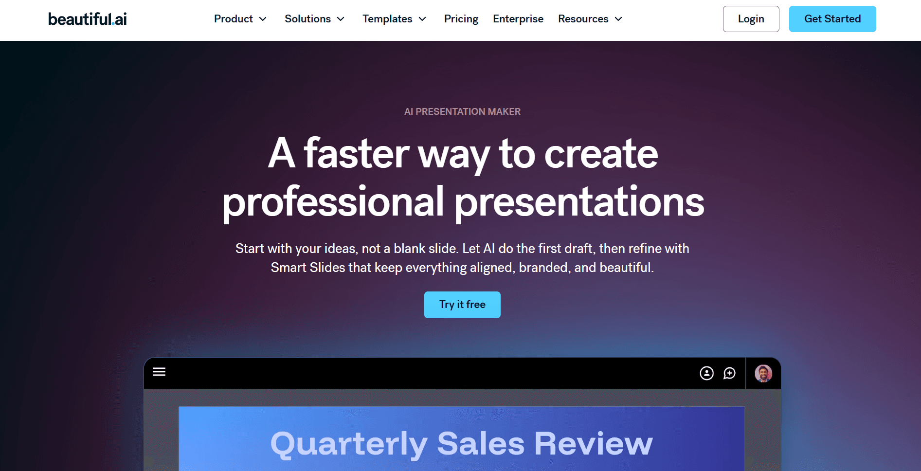 If NoteGPT's biggest problem is that nothing moves once the deck generates, Beautiful AI provides a direct solution to that specific frustration. But where it differs most from every other tool in this comparison is its approach to design: rather than generating from scratch, it works from a library of Smart Slide templates where every layout is pre-engineered to look good regardless of how much or how little content you put in it. Add a fourth bullet point and the font scales to fit. Remove an image and the text expands to fill the space. The templates do the design thinking so you don't have to.