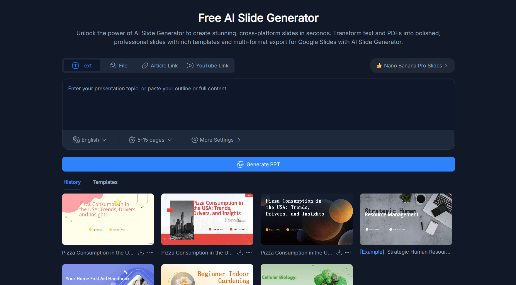Thin content from short prompts. Without a rich source document, NoteGPT pads slides with generic statements and repeated points. A two-sentence prompt produces filler. A detailed PDF or YouTube video produces solid content. The tool's quality is source-dependent in a way that dedicated slide generators are not.