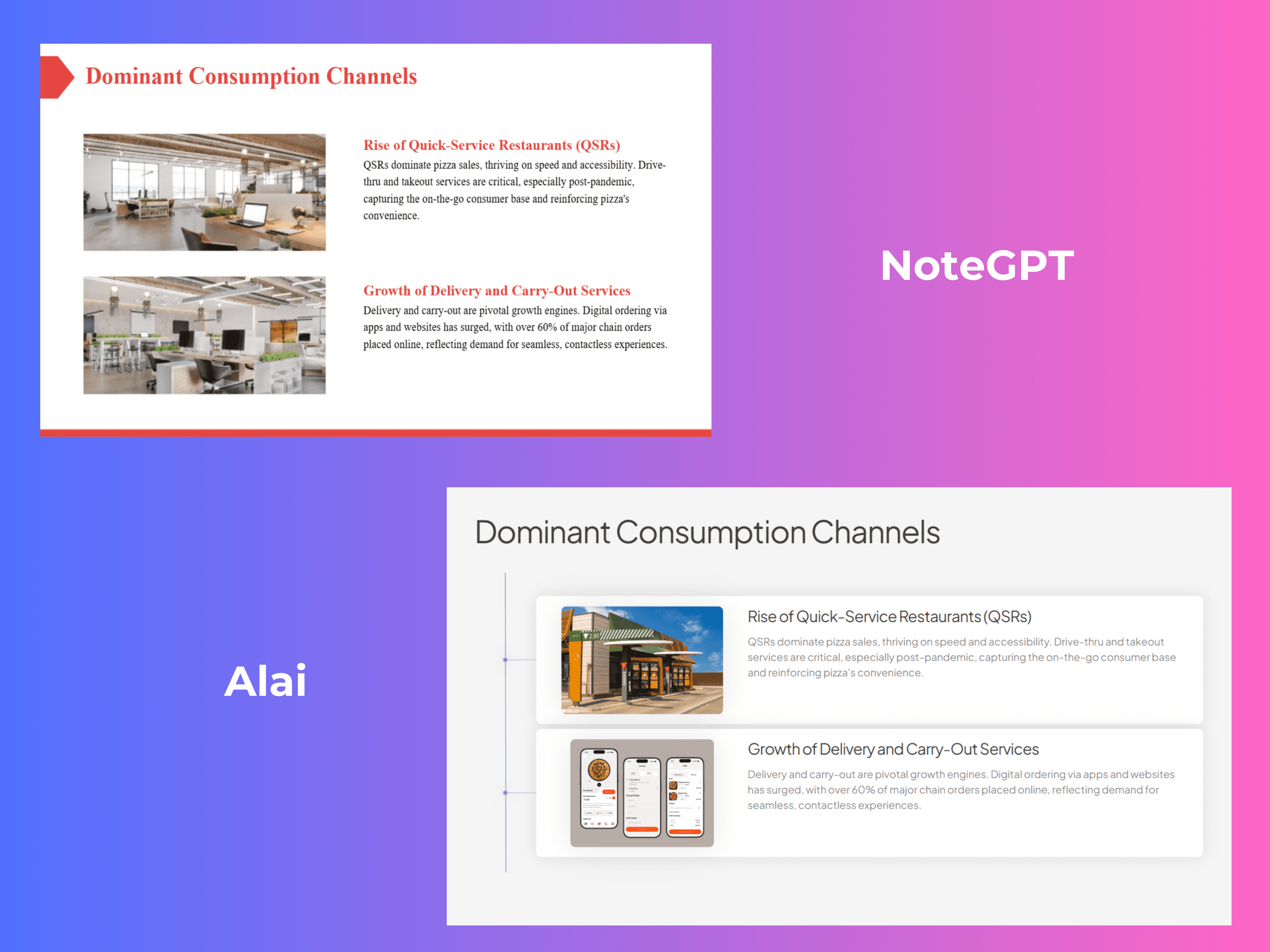 The presentation design is flat and repetitive. The template library is built around two or three basic PowerPoint layouts: heading plus text block, and heading plus text plus image. There are no gradients, no depth effects, no visual hierarchy beyond font size differences. Every slide feels like a flat image. A tool like Alai generates four design variants per slide, each applying spacing, depth, and typographic hierarchy the way a designer would. NoteGPT generates one, and it is always the most basic one.