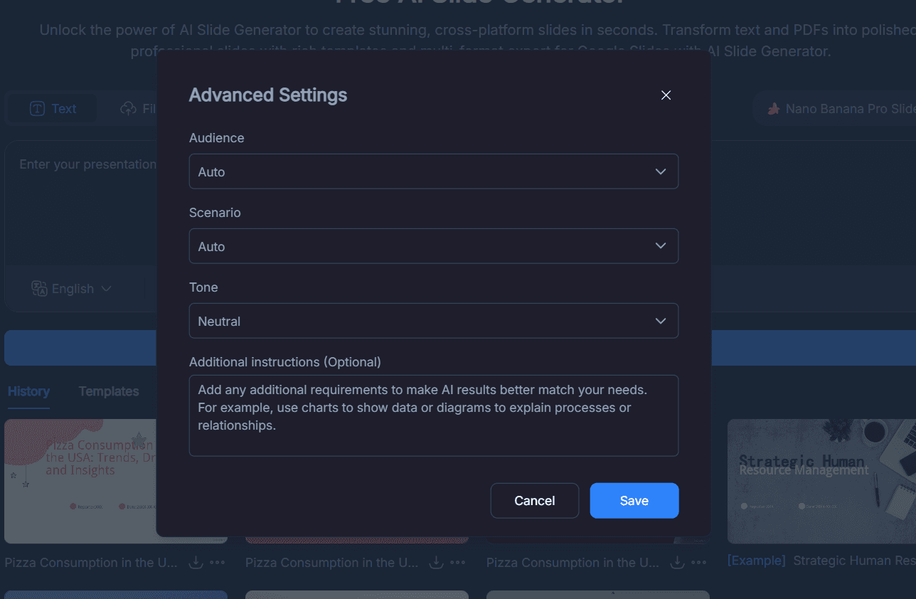 Step 2: Set your parameters. Before generating, you configure language, number of slides, target audience, tone, and any additional instructions. These settings matter. The same source content produces noticeably different output depending on how you define the audience and tone.