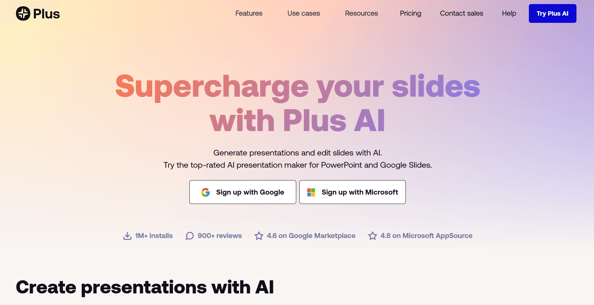 Plus AI is the only tool in this comparison that works natively inside Google Slides and PowerPoint rather than as a standalone platform. You install it as an add-on, and it generates presentations directly inside the tools you are already using. There is no export step, no format translation, no layout cleanup after downloading. The deck is a native Google Slides or PowerPoint file from the moment it is created.