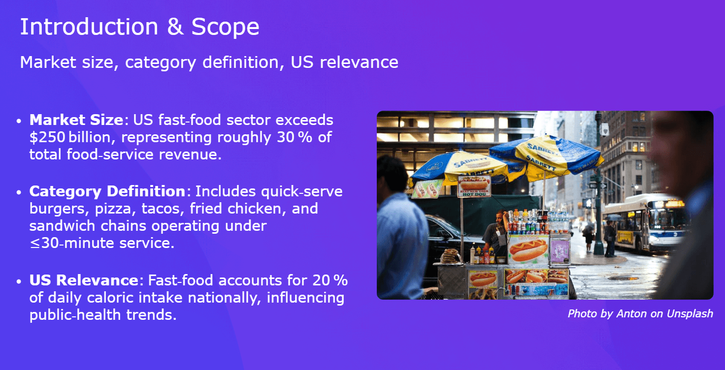 The bullet format is applied to everything. SlidesGPT formats every piece of information as a bolded label followed by a colon and a sentence. "Market Size: US fast-food sector exceeds $250 billion." "Category Definition: Includes quick-serve burgers, pizza, tacos..." This pattern is rigid. It works when you genuinely have a list of definitions or facts. It breaks down when the information would be better expressed as a comparison, a step-by-step process, or a visual data point. SlidesGPT doesn't distinguish between these: it renders everything the same way.