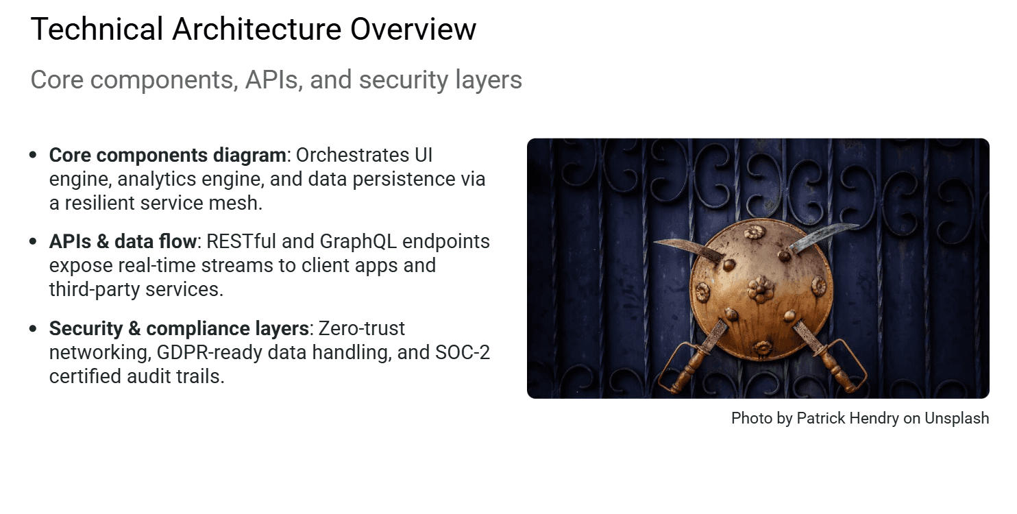 Design quality built on actual design principles. Most AI presentation tools, including SlidesGPT, apply the same fixed grid to every slide: same margins, same text widths, same spacing ratios, different colors. Alai is built around the four dimensions that actually separate professional slides from AI-generated ones: intentional use of space, depth through layering, typographic hierarchy, and visual detail. In practice, this means slides use gradients, shadows, and layered elements rather than flat backgrounds. Whitespace is used deliberately so headlines and key points have room to breathe rather than text filling every available pixel. Typographic hierarchy guides the reader's eye through font weight, size, and contrast rather than making everything the same size. The result is output that looks professionally designed rather than assembled from a template. For teams comparing Alai to SlidesGPT side by side, the design gap is visible immediately (as seen below).