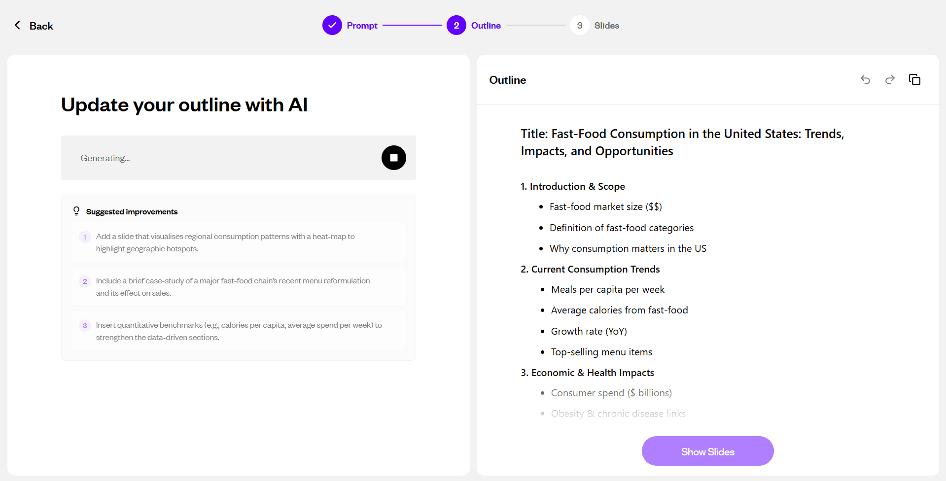No structured outline review before generation, which gives you less control over the deck structure than SlidesGPT