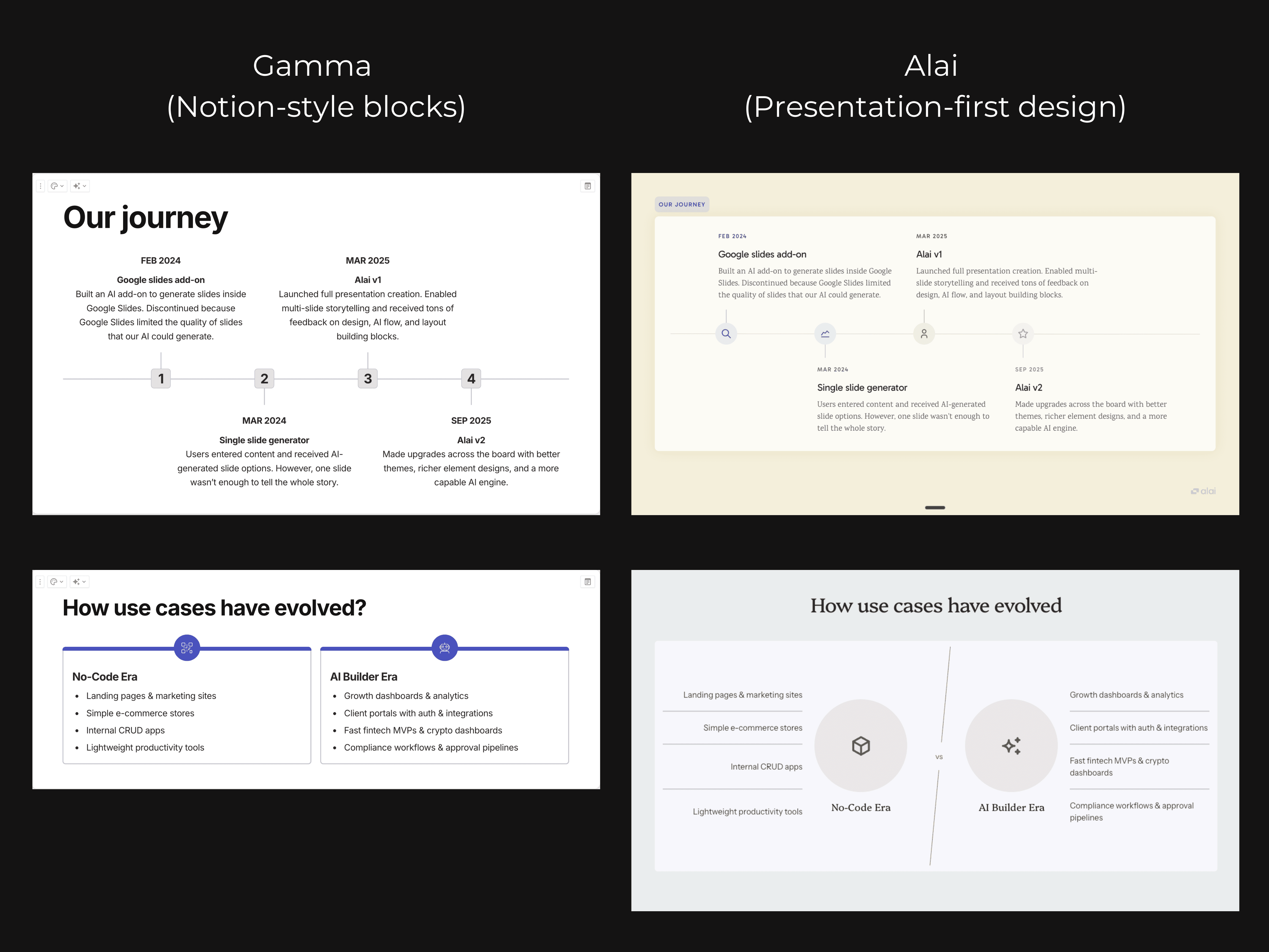 Design quality matters, but so does speed. Here's where Alai separates itself from tools that slow you down.