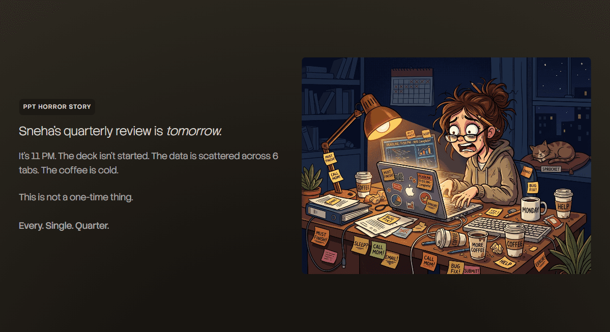 Script: "Imagine it's Sunday night. Your quarterly review is tomorrow at 9am. Your deck is a mess of screenshots and you're still rebuilding slide two."