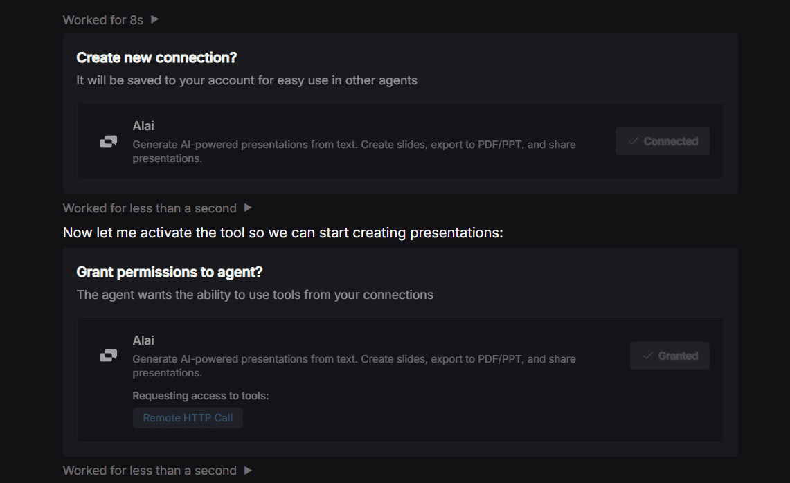 Start a new agent in Tasklet and mention creating a presentation with Alai. Tasklet will prompt you to set up the connection. Just confirm and grant permissions. No API key or configuration file needed. The whole process takes under two minutes.