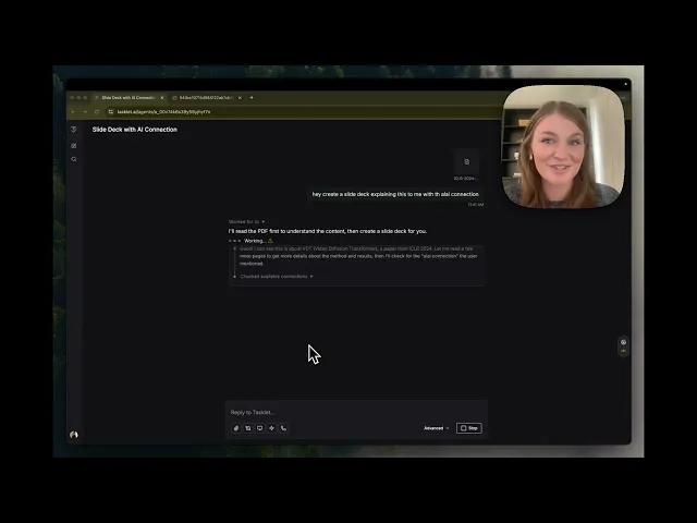 The multi-tool workflow: You upload a detailed PDF - a research report, a lengthy brief, a whitepaper, or an internal document and Tasklet passes it to Alai, which extracts the key information and structures it into a clean, polished presentation. Dense walls of text become digestible slides your or your audience can actually follow.