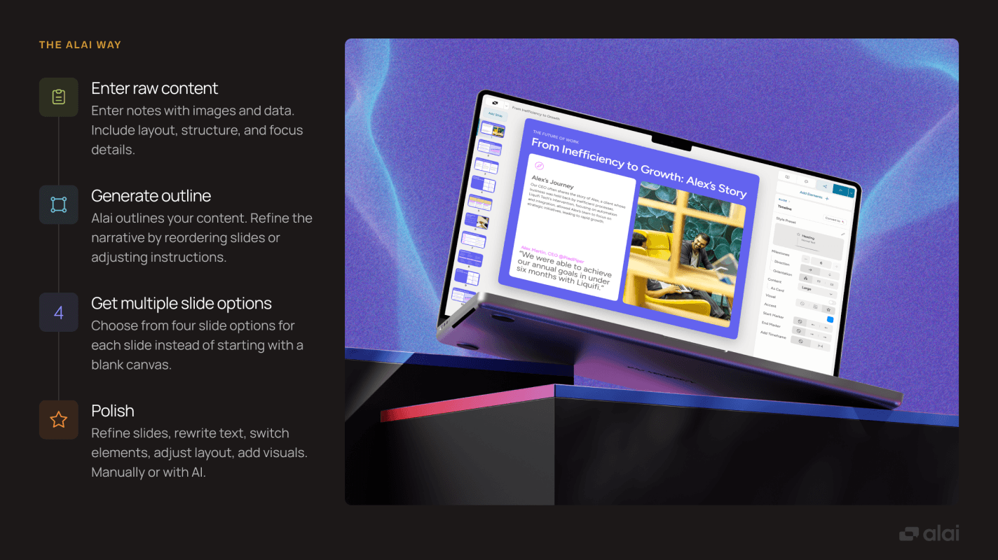 "Я пробовал все инструменты для презентаций на основе ИИ. Логика Alai намного превосходнее."